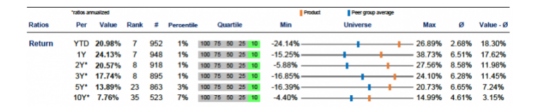 Sowohl beim Risiko-Rendite-Profil als auch bei der relativen Performance gegenüber der Peergroup weist er eine starke Outperformance aus. Damit wird die Strategie auch von unabhängiger Seite in ihrer Qualität bestätigt.