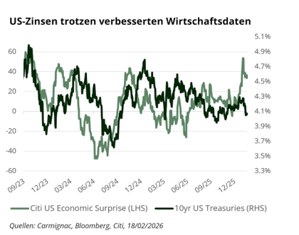 Die US-Wirtschaft zeigt sich weiterhin widerstandsfähig. Die Frühindikatoren deuten weiterhin auf ein Wachstum von etwa 2 bis 2,5 % im Jahr 2026 hin, unterstützt durch KI-getriebene Investitionen und die fiskalischen Impulse, die in der „One Big Beautiful Bill” enthalten sind. Der Arbeitsmarkt hat sich abgekühlt, ist aber nicht zusammengebrochen. Die Arbeitslosigkeit hat sich bei etwa 4 % stabilisiert und ist damit weit von einer Rezession entfernt.