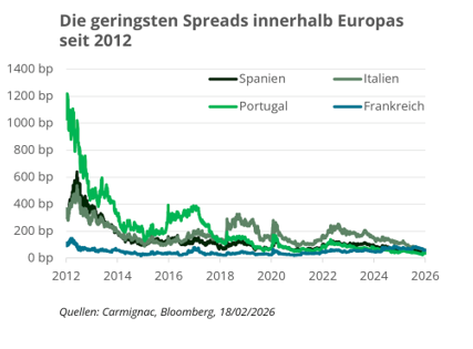 Europas Peripherie: enge spread, fragiles Fundament Während Deutschland als finanzpolitische Säule für die Erholung der Eurozone gilt, ist das Bild anderswo differenzierter. Die Faktoren, die die Stabilität Deutschlands untermauern – glaubwürdige Institutionen, starke fiskalische Kapazitäten und der Status als sicherer Hafen – haben in den Peripherieländern keinen einheitlichen Einfluss. Die Spreads bleiben historisch gesehen eng, was einen von Carry-Strategien und der Suche nach Rendite getriebenen Markt widerspiegelt. Dieses Umfeld birgt jedoch die Gefahr, dass die zugrunde liegenden finanziellen und politischen Schwachstellen in bestimmten Ländern verdeckt werden, wobei Frankreich ein besonders auffälliges Beispiel ist.