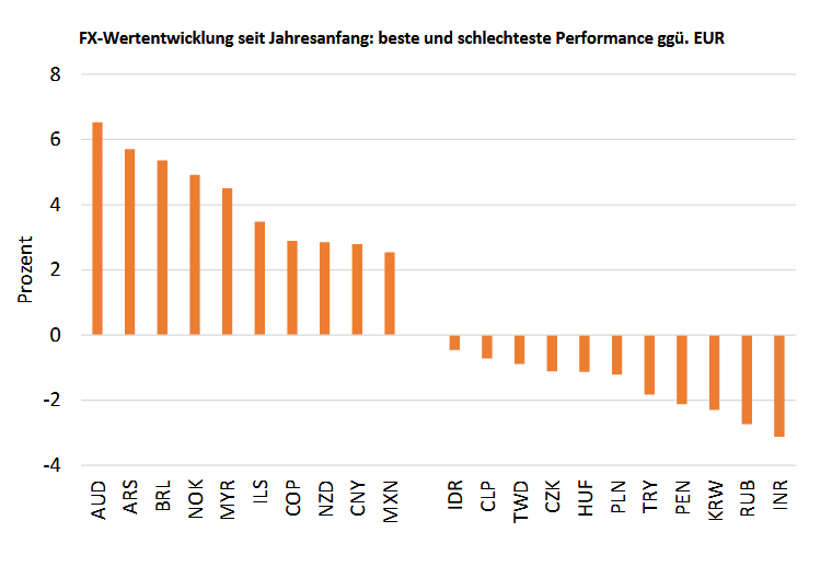 Der Euro hat bis dato kein sonderlich gutes Jahr aufs Parkett gelegt – zumindest, wenn man die Wertentwicklung von EUR/USD als Bemessungsgrundlage heranzieht. Wie es um den Zustand der Gemeinschaftswährung bestellt ist, lässt sich allerdings viel besser einordnen, wenn man die Performance seit Jahresbeginn gegen eine Vielzahl von Währungen betrachtet. Die unterschiedliche Entwicklung der Währungen gegenüber dem Euro seit Jahresbeginn lässt sich im Wesentlichen durch drei Faktoren erklären: Zinsdifferenzen, Rohstoffabhängigkeit und geopolitische bzw. strukturelle Risiken, wobei der Iran-Konflikt bei allen drei Aspekten einen entscheidenden Einfluss hatte.