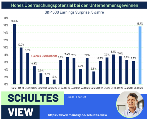 Für den S&P 500 erwartet der Markt für das erste Quartal ein EPS-Wachstum von rund 12,5 Prozent, was das sechste Quartal in Folge mit zweistelligen Zuwachsraten im Jahresvergleich bedeuten würde. Gerade im Technologiebereich erwarten wir erneut deutlich bessere Zahlen, sodass es für den Gesamtindex möglich ist, rund 20 Prozent Gewinnwachstum zu erzielen. Das wäre der stärkste Wert seit dem Post-Corona-Boom 2021.