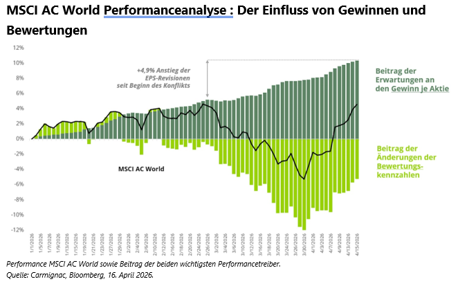 Eine Untersuchung der Performancefaktoren wichtiger globaler Indizes bringt Licht in dieses scheinbare Paradoxon. Die Bewertungskennzahlen konnten die Märkte nicht stützen; sie sanken insgesamt. Dividenden spielten ebenfalls nur eine untergeordnete Rolle. Es sind also die Gewinne; die Gewinndynamik erklärt den Aufschwung an den Märkten. Seit Beginn des Iran-Konflikts wurden die Gewinnwachstumserwartungen für 2026 um mehr als 4 % angehoben und liegen nun bei rund +20 % für den globalen Aktienindex!1 Dieser Faktor erklärt die Widerstandsfähigkeit der Märkte trotz der Unsicherheiten. Im deutlichen Gegensatz zu den positiven Gewinnerwartungen steht das angespannte Umfeld aus restriktiveren Finanzbedingungen, steigenden Zinsen in Verbindung mit höherer Inflation, sich abschwächender Konjunktur und einem bereits weitgehend ausgeschöpften Druck auf Kosten und Margen.